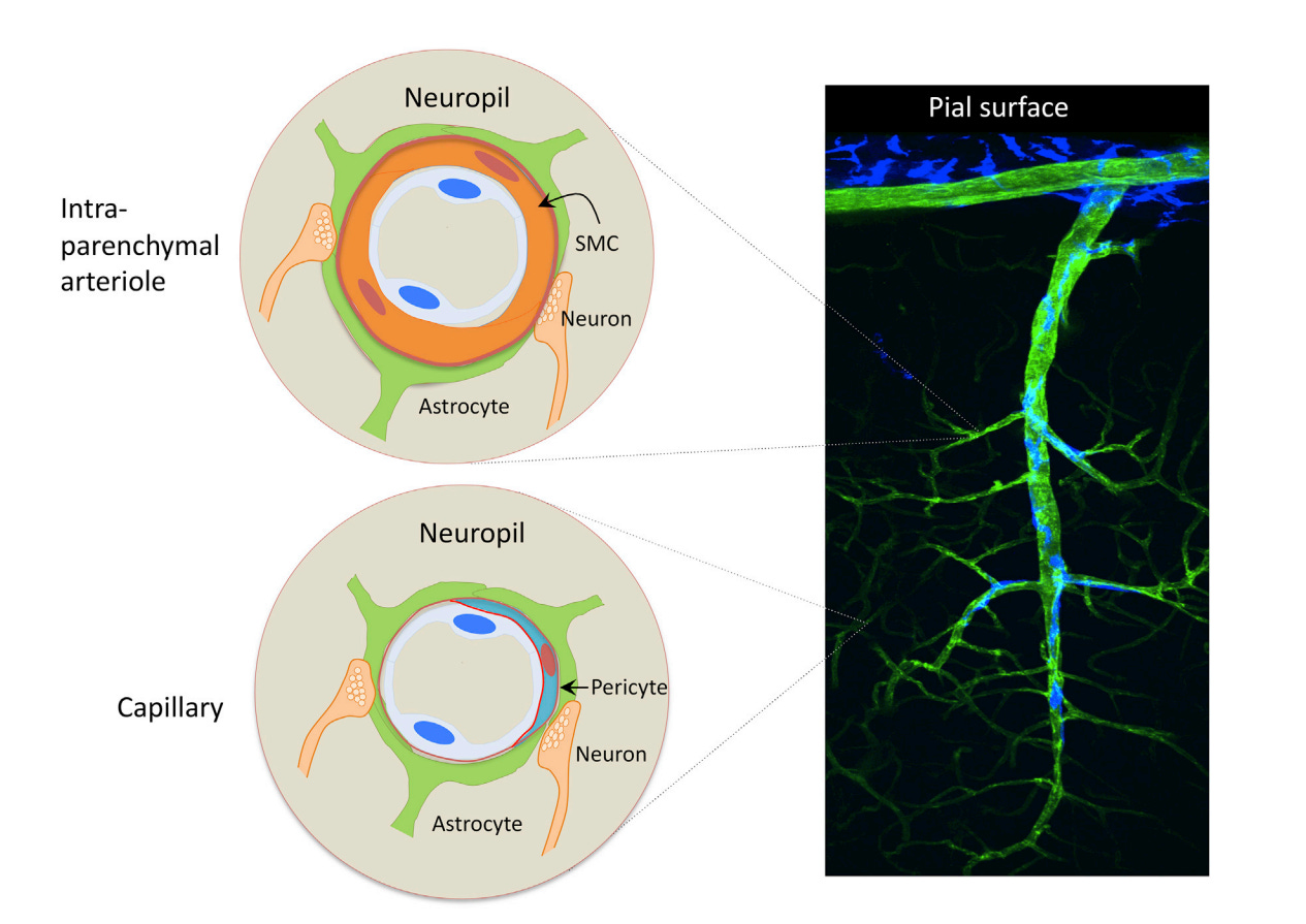 8) As arterioles transition into cerebral capillaries, SMCs are replaced by pericytes, mural cells embedded into the endothelial basement membrane, covering approximately 30% of the vascular surface and occasionally extending “peg and socket” protrusions into endothelial cells. Like in arterioles, the circumferences of the capillaries is covered by astrocytic endfeet, although neural processes can be at times observed next to the capillary basal lamina