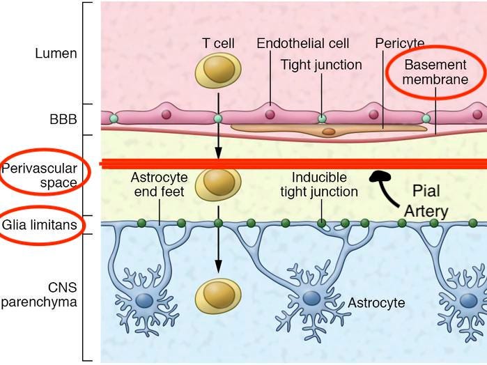 4) Pial arteries dive into the substance of the brain surrounded by an extension of the subarchnoid space, the perivascular space, a virtual space delimited by the vascular basement membrane and the glia limitans