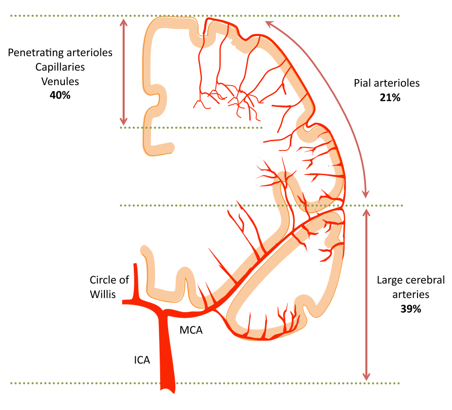 1) Starting off at the the Circle of Willis (the joining area of several arteries at the bottom side of the brain), cerebral vessels run on the brain surface within the subarachnoid space (pial arteries and arterioles), forming a highly collateralized network