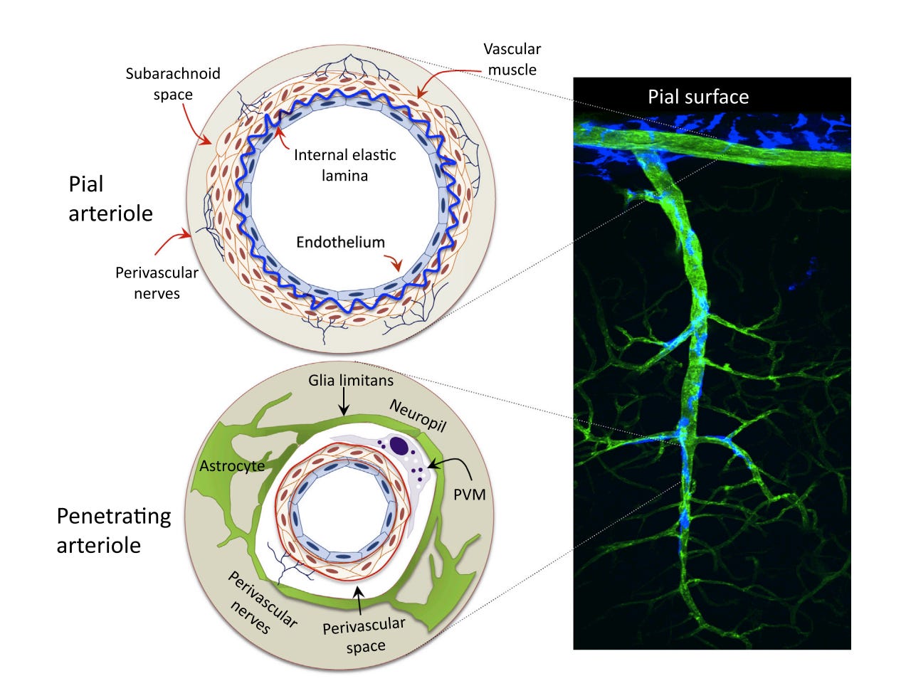 2) Pial arterioles have multiple layers of smooth muscle cells (SMCs) separated from the endothelium by a prominent elastic lamina